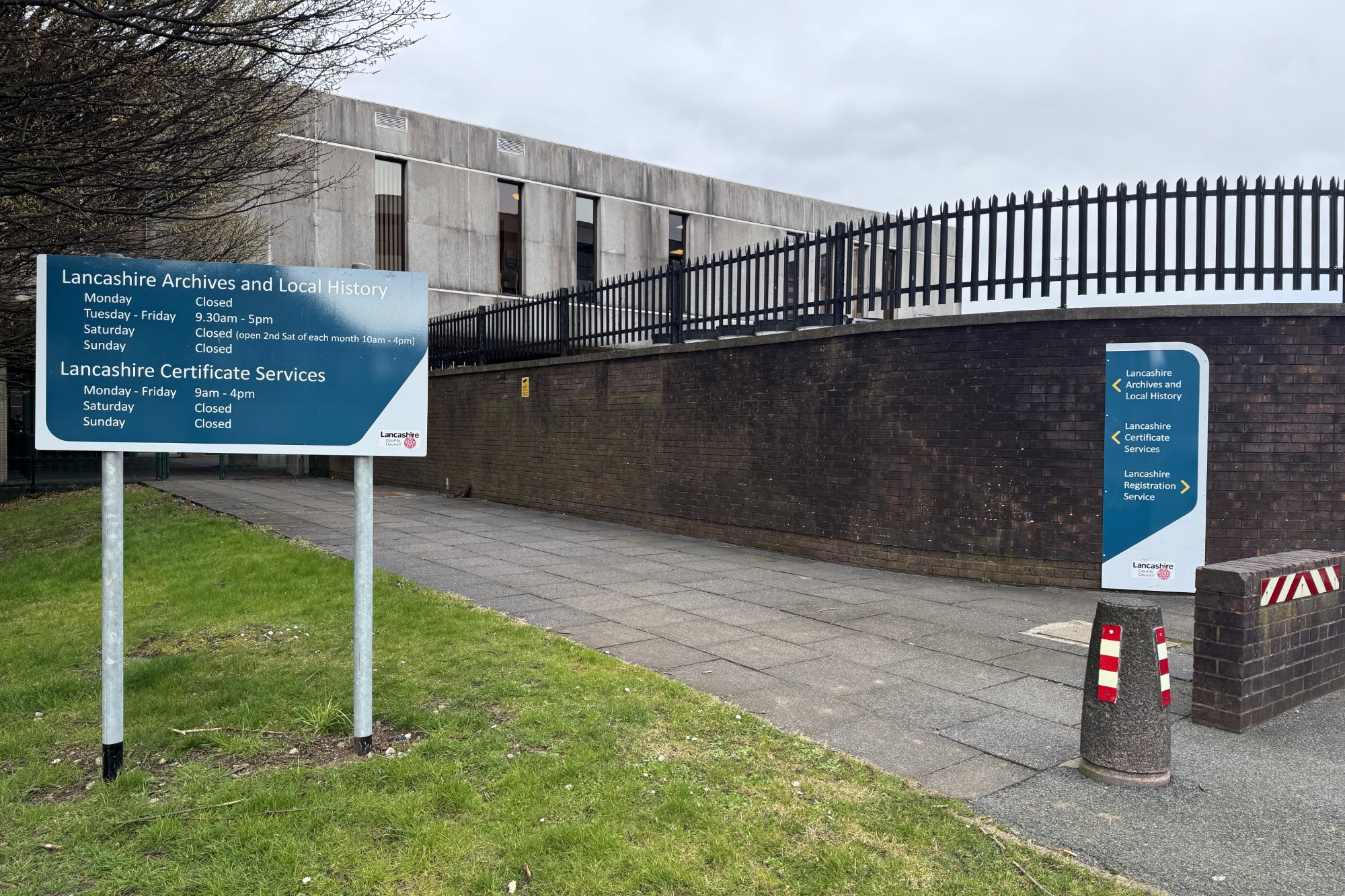 プレストン駅の北西に、ランカシャー・アーカイブズ(Lancashire Archives)があります。建物の入口には、ランカシャー・アーカイブズ&ローカル・ヒストリー(Lancashire Archives and Local History)、ランカシャー証明書サービス(Lancashire Certificate Services)と書かれた掲示板。