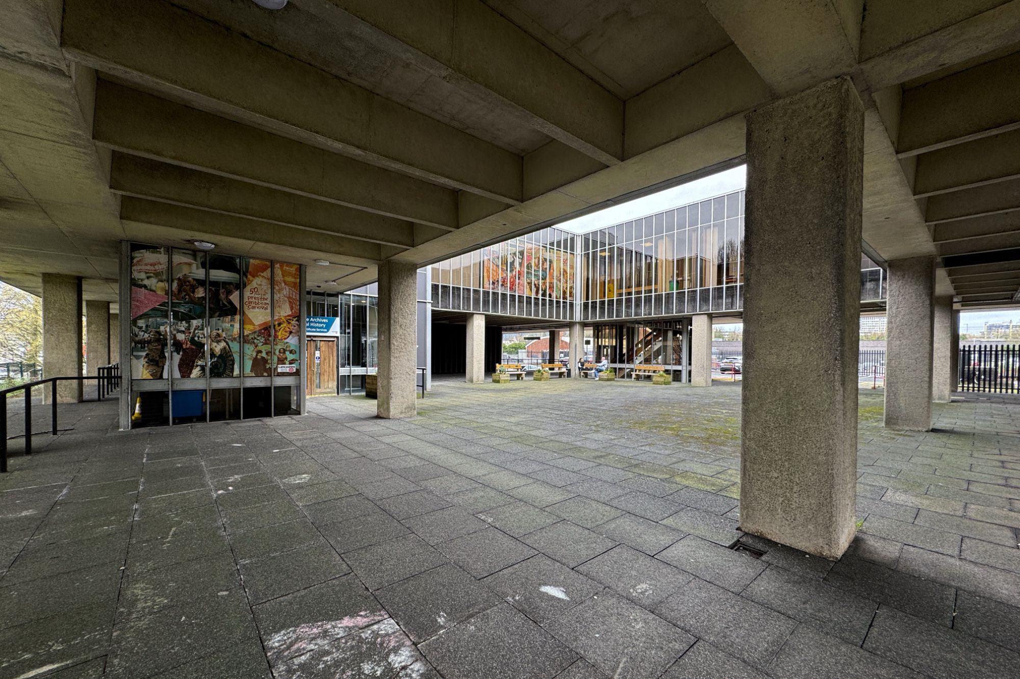 ランカシャー・アーカイブズの建物はロの字の中庭を囲むように配置されており、1階部分はピロティになっています。