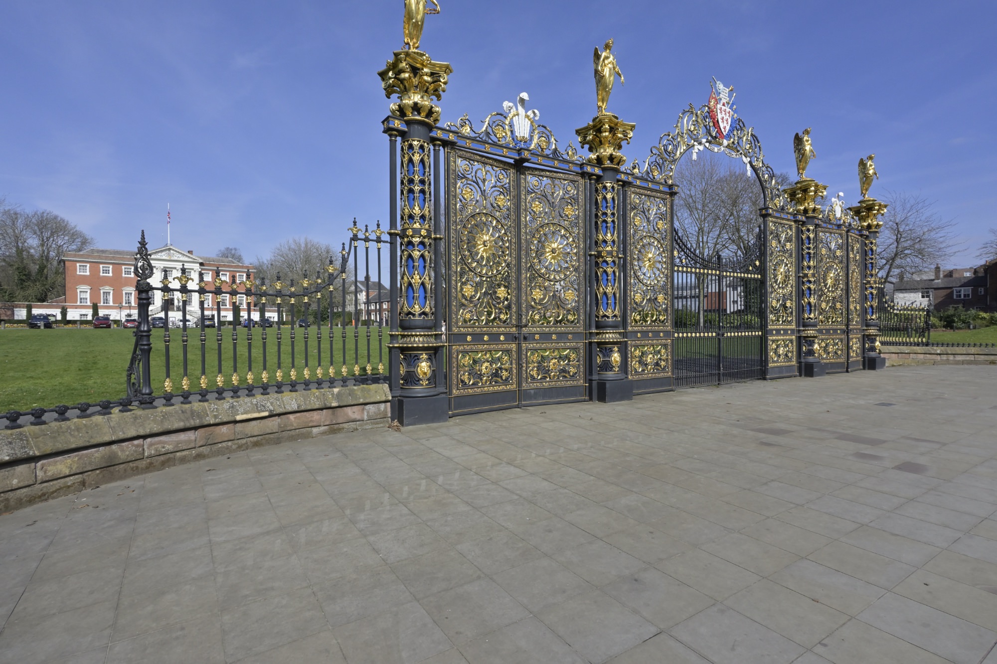 門の内側は芝生の広場になっており、奥にウォーリントン・タウンホール(Warrington Town Hall)があります。芝生の広場では、若いカップルが結婚写真を撮影していました。