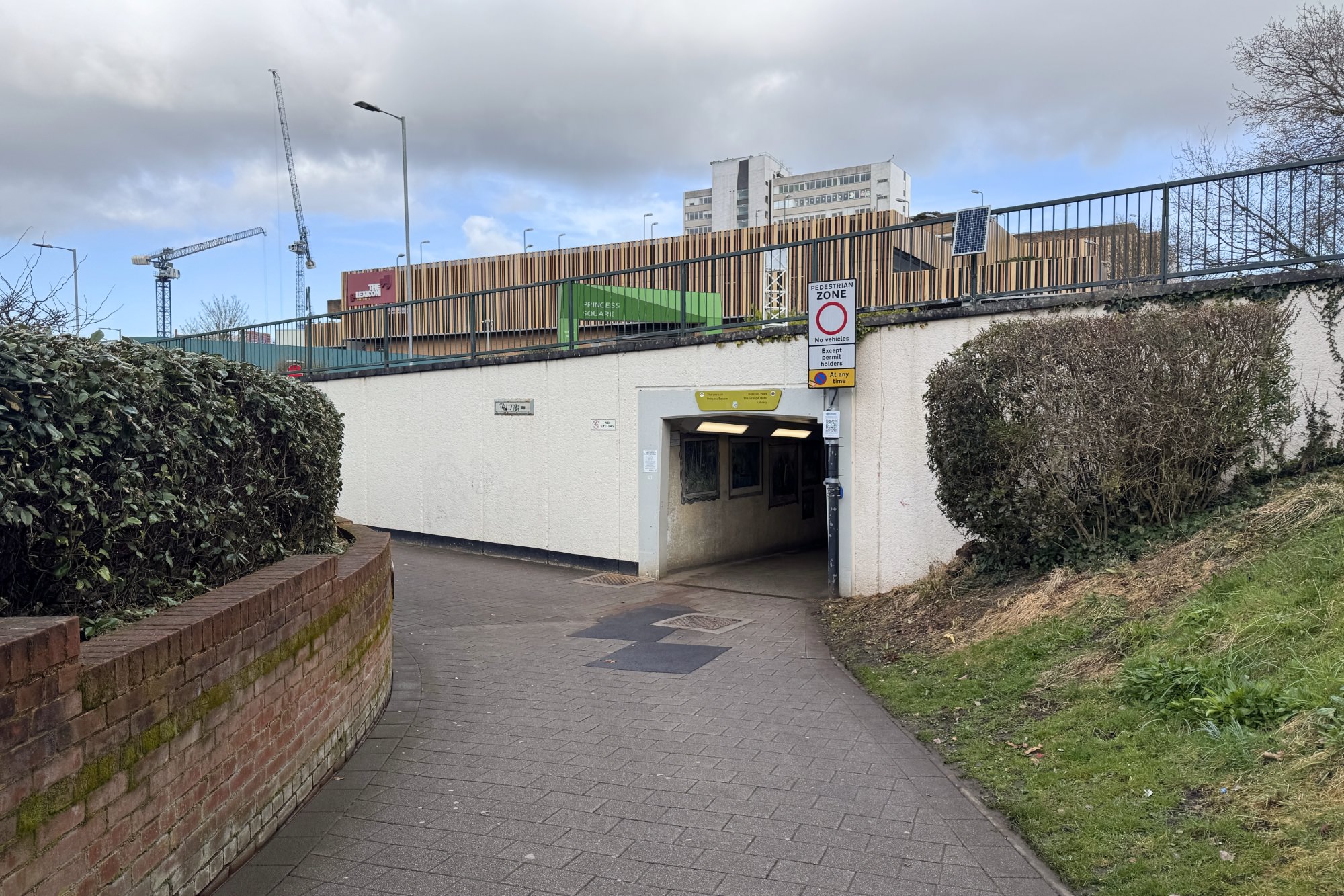 ブラックネルを歩いて、歩行車線道路と自動車専用道路による歩車分離が徹底されているという印象を受けました。駅から、マーケット・ストリート(Market St)の下を潜るように歩行者専用道路が通されています。歩行者専用道路はバスターミナルの脇を通り抜けて、ザ・リング(The Ring)の下を潜り、タウンセンターにつながっています。