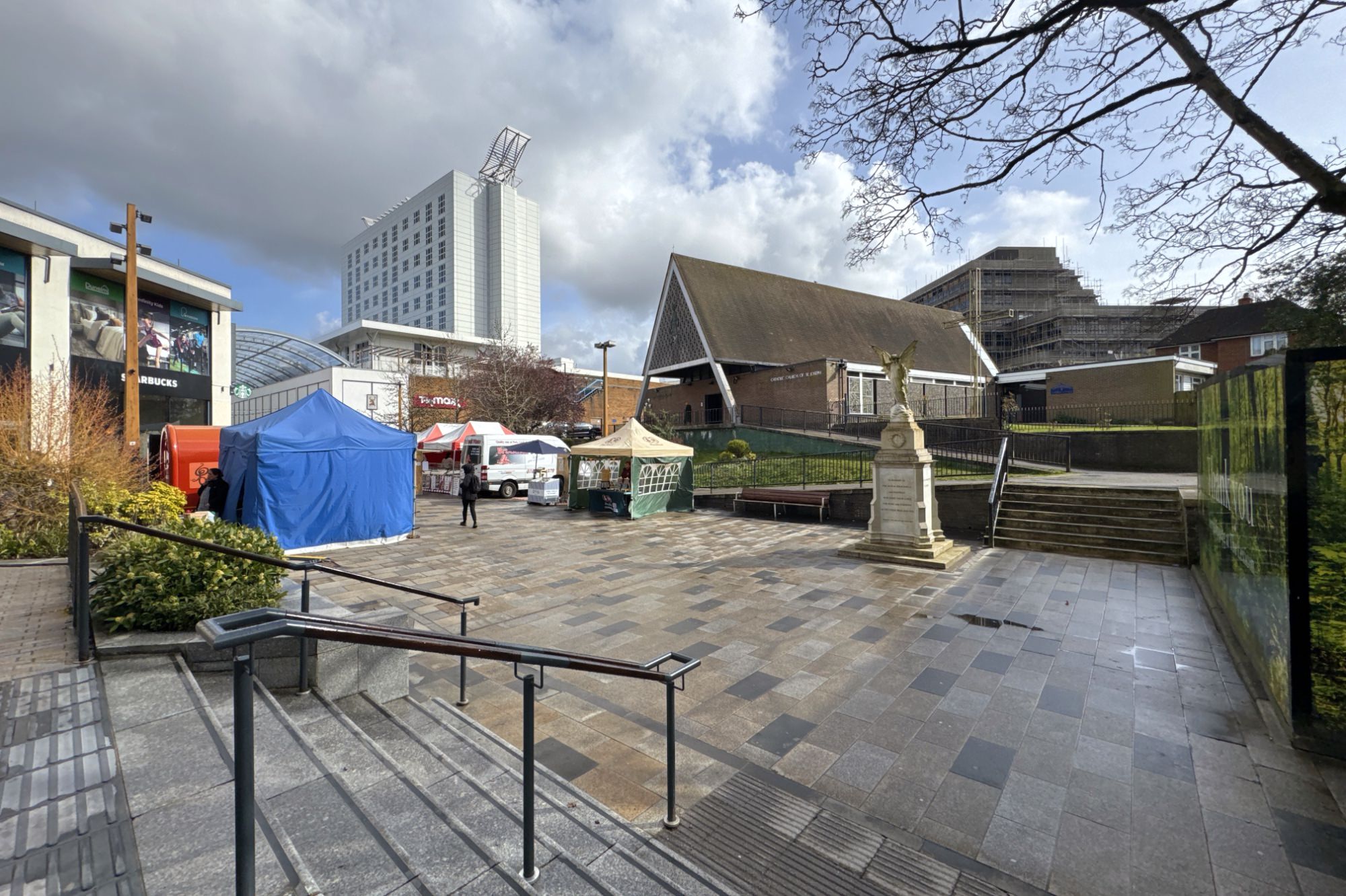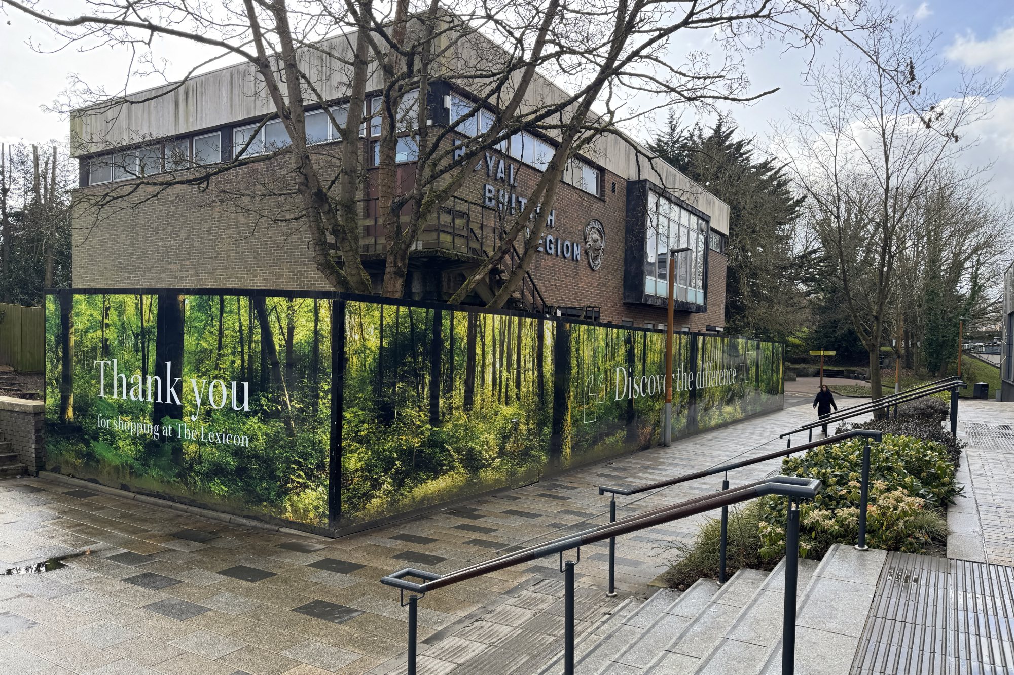歩行者専用道路を歩いて、ザ・リング(The Ring)の下を潜ると、タウンセンターに到着。すぐ右手に、ロイヤル・ブリティッシュ・リージョン(英国在郷軍人会連盟、Royal British Legion)。建物は仮囲いで囲われていました。