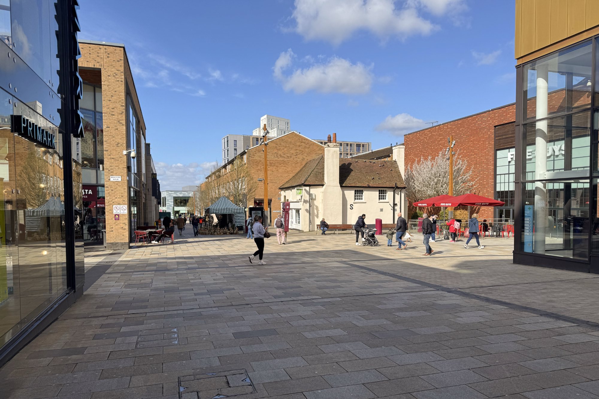ザ・レキシコンは歩行者専用の通りで、自転車、Eスクーターの通行は禁止。ハイ・ストリート(High Street)とブラカン・ウォーク(Braccan Walk)の交差点にあるユニオン・スクエア(Union Square)の一角には、古い建物が保存されていました。