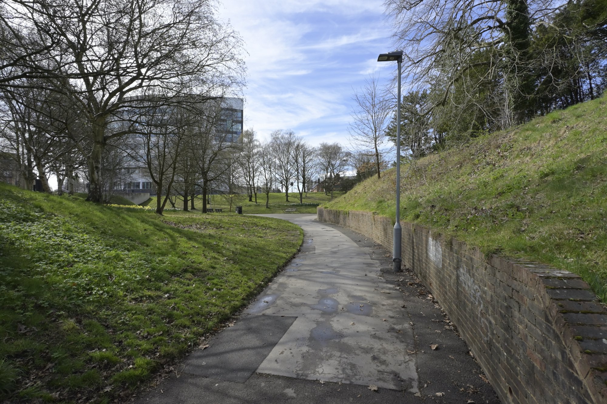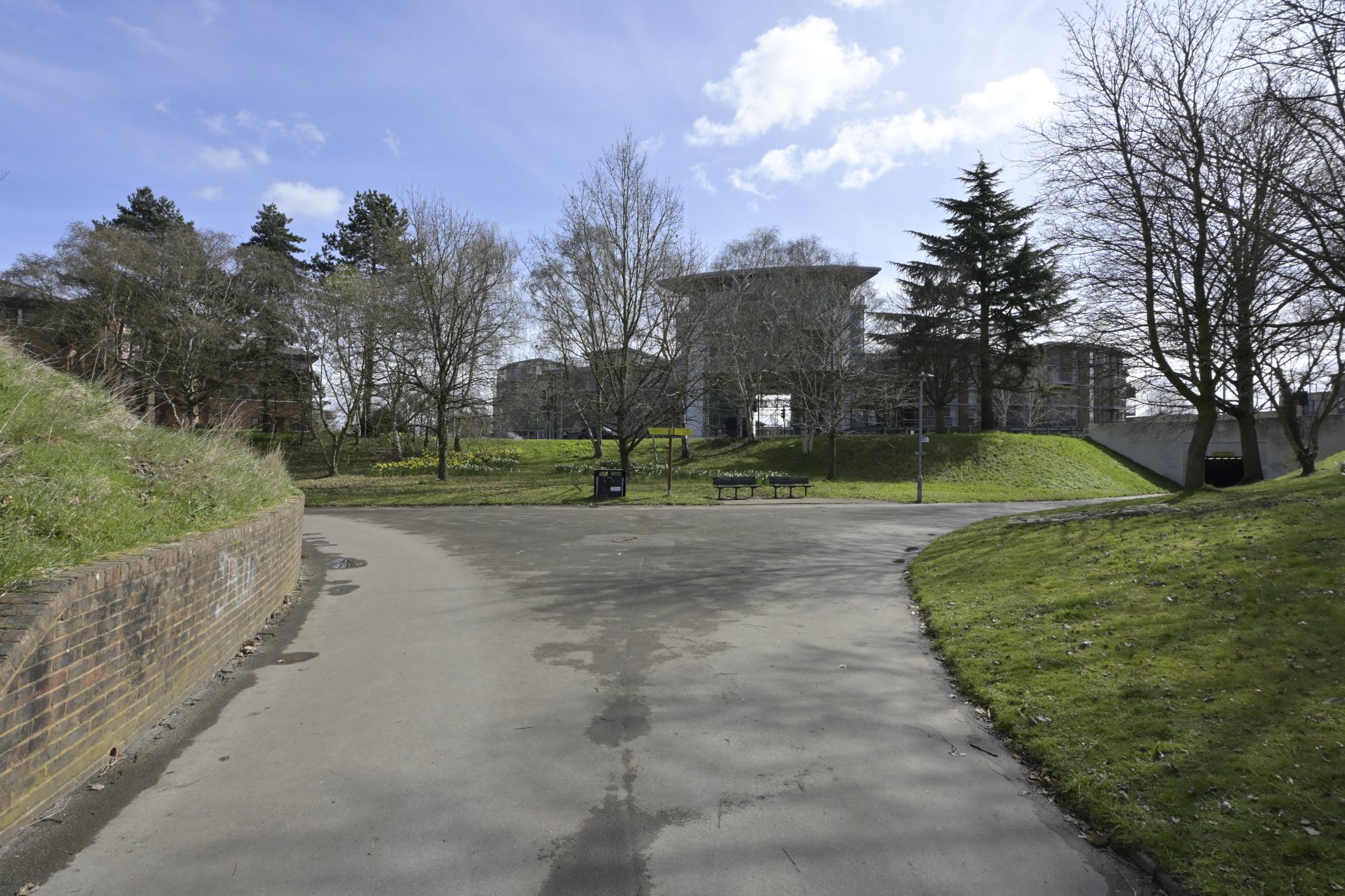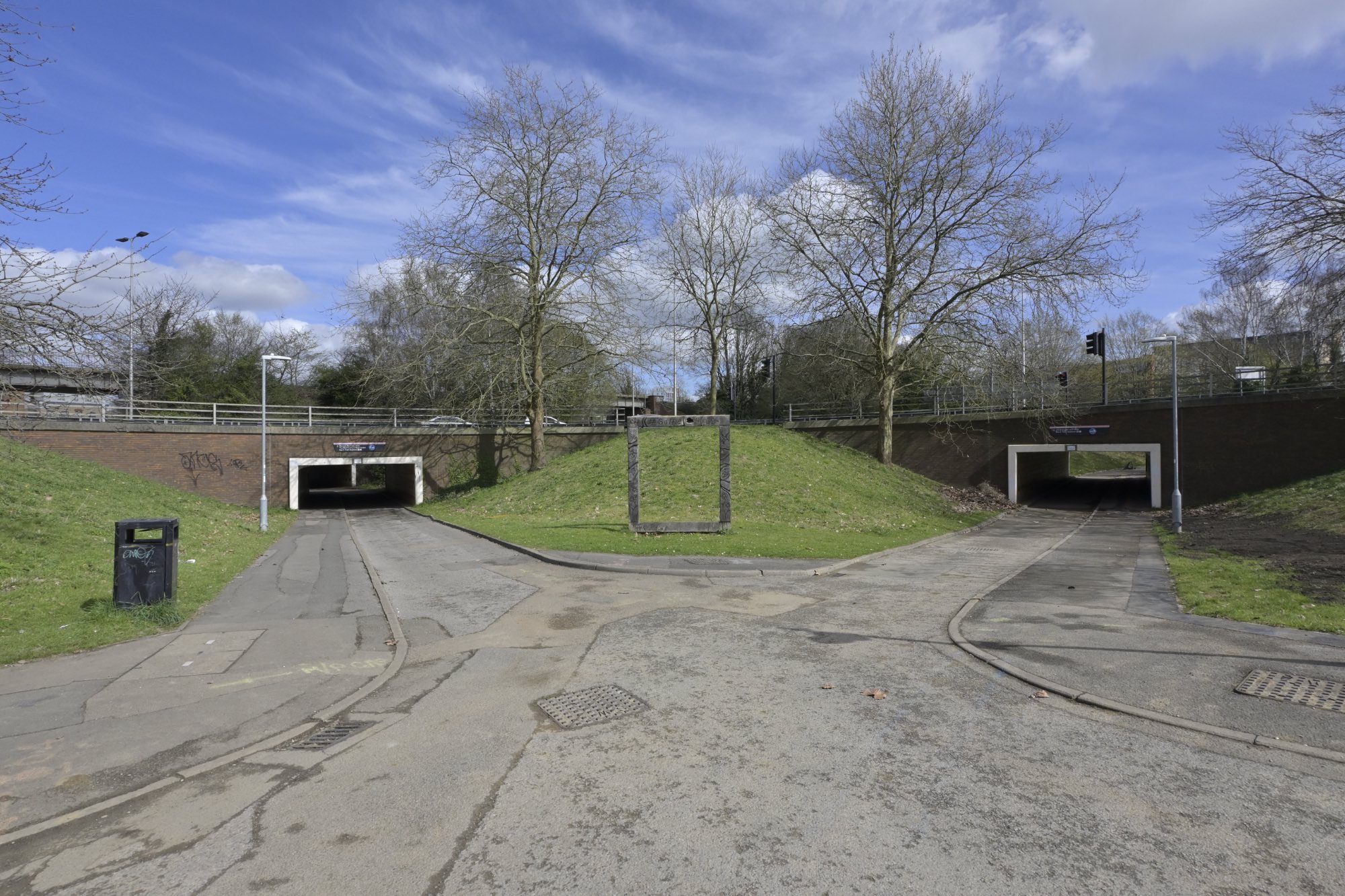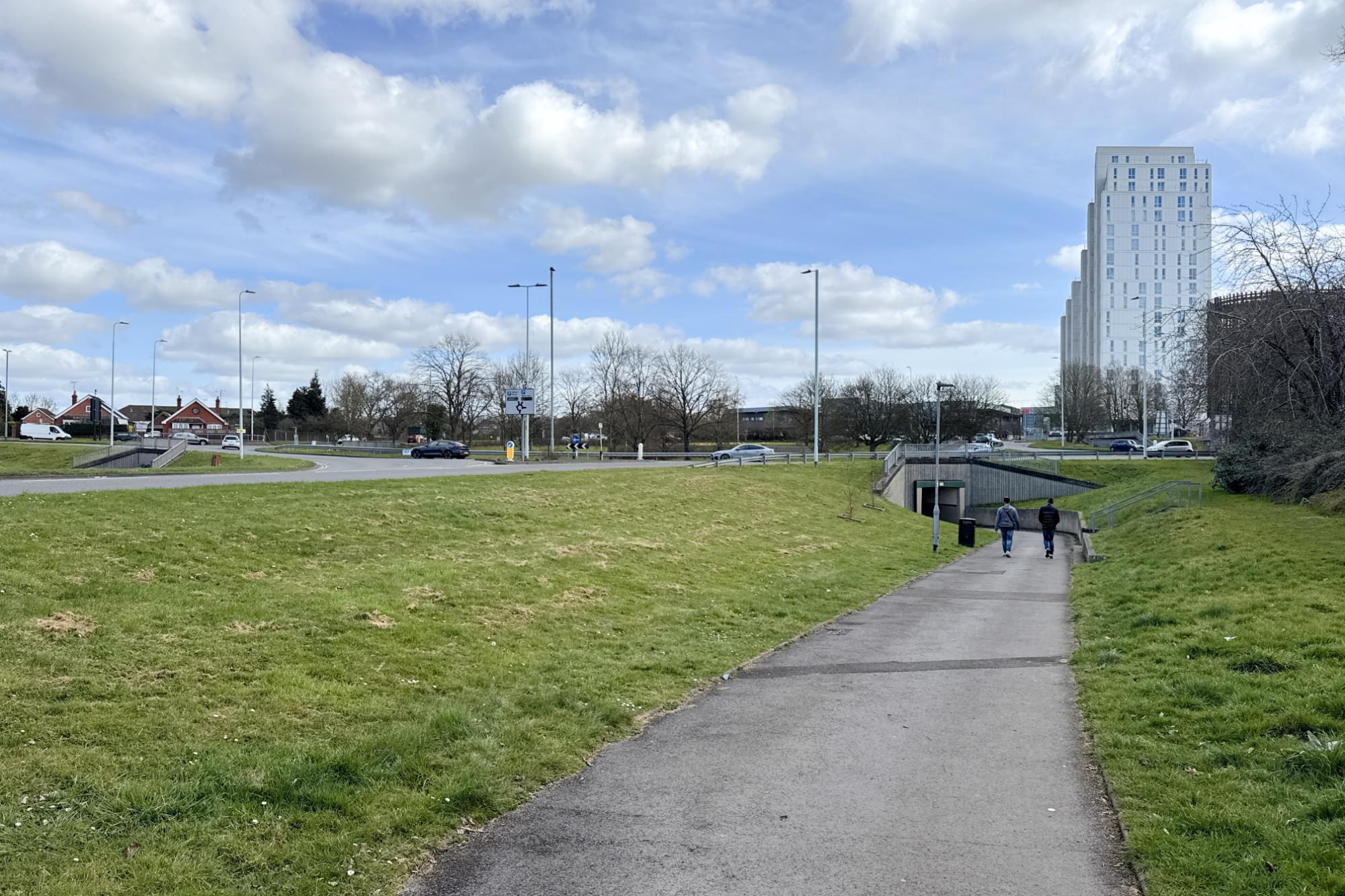 タウンセンターの西(ウェイトローズの西)にも大きなラウンドアバウト(Western Roundabout)があります。このラウンドアバウトの下には、歩行者専用道路と自転車専用道路が通されています。先ほど訪れたラウンドアバウトと同じく、ラウンドアバウト内は公園のようになっていました。