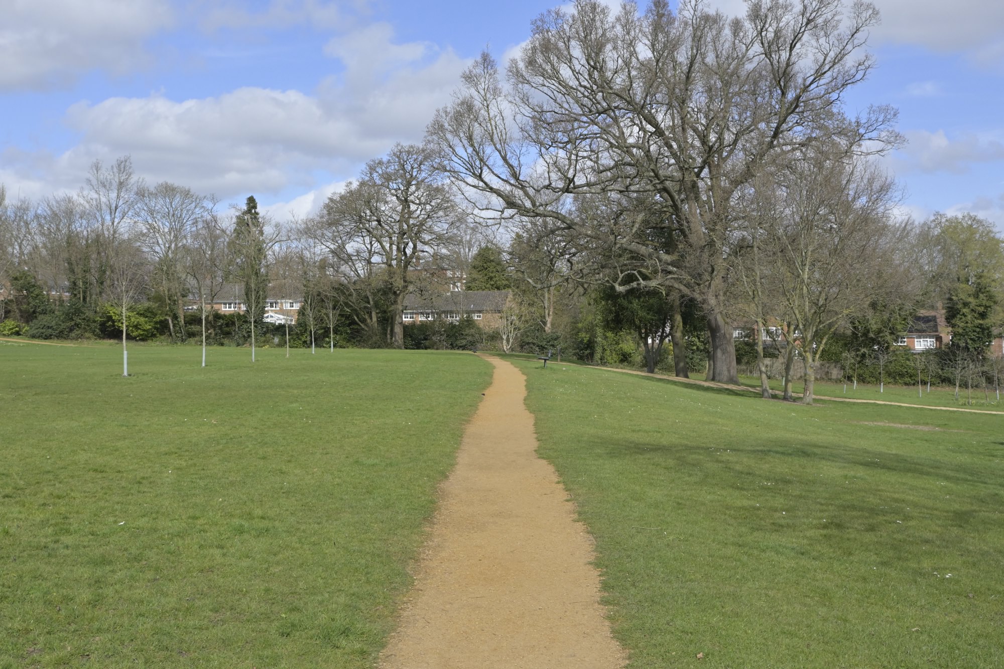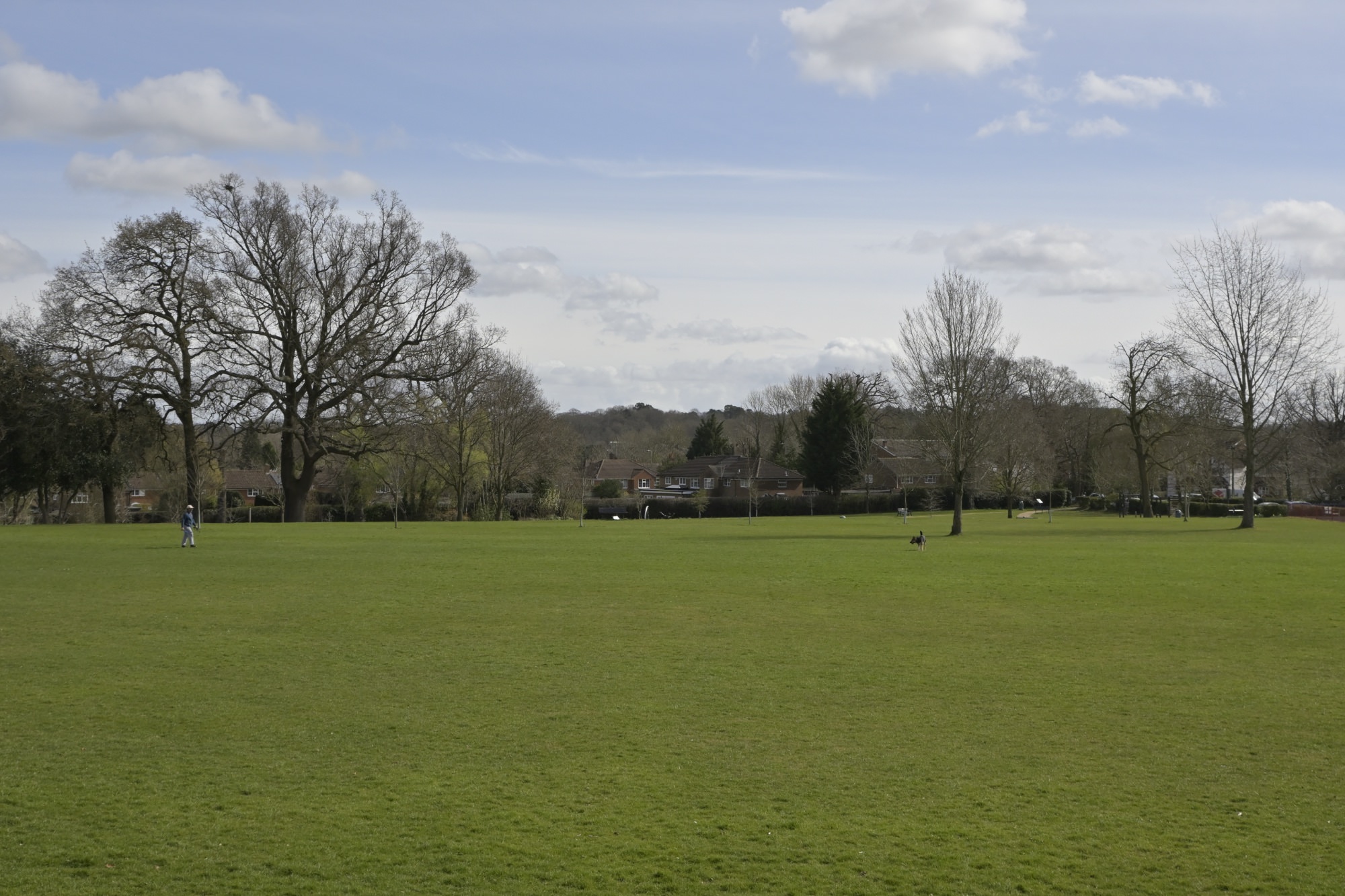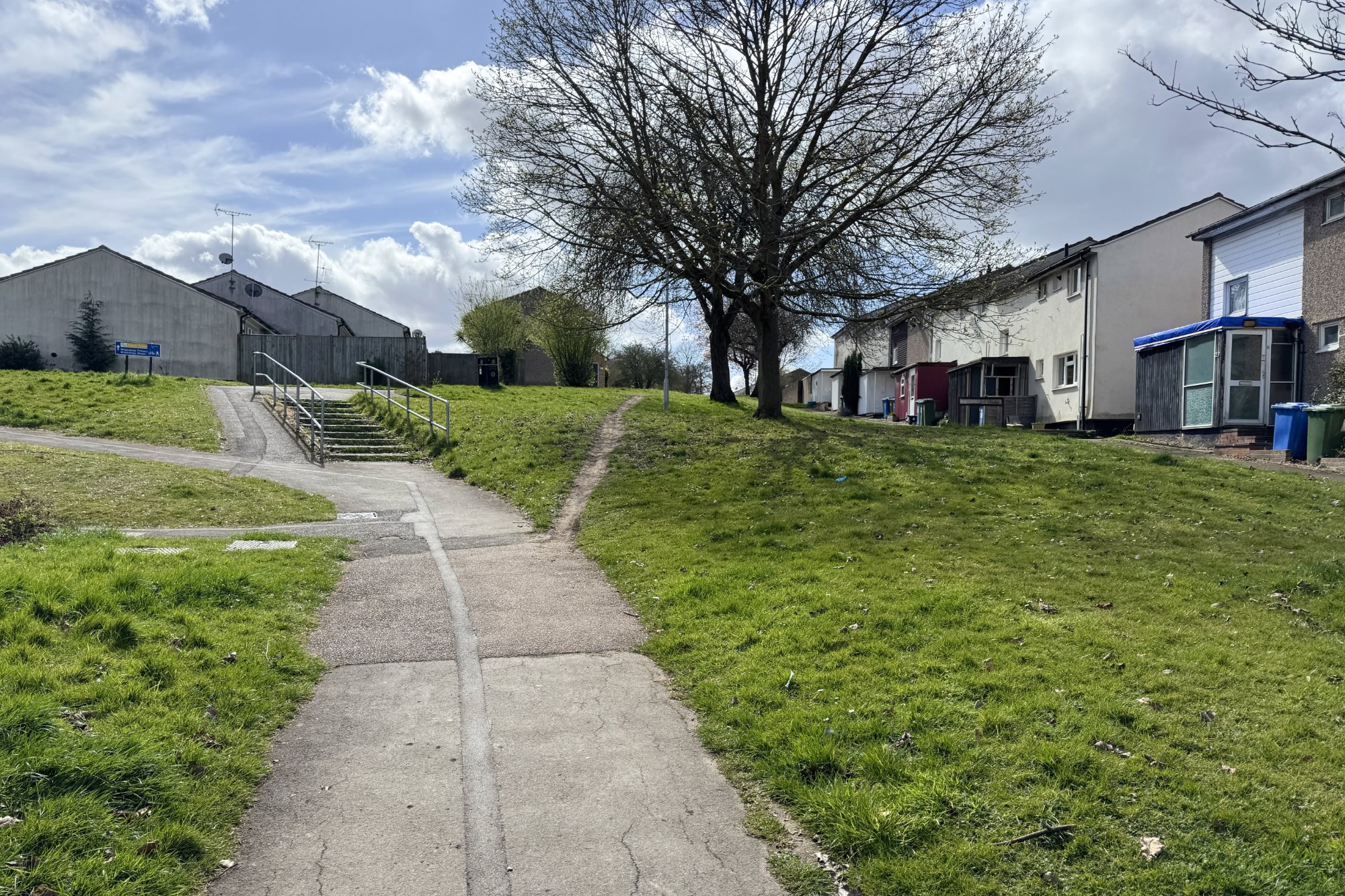 歩行者専用道路は、ラウンドアバウト内で2つに分岐。北側の歩行者専用道路を歩いていくと、ザ・エルムス・パーク(The Elms Park)という大きな芝生の広場のある公園。犬の散歩をしている人、子どもを遊ばせている人などを見かけました。