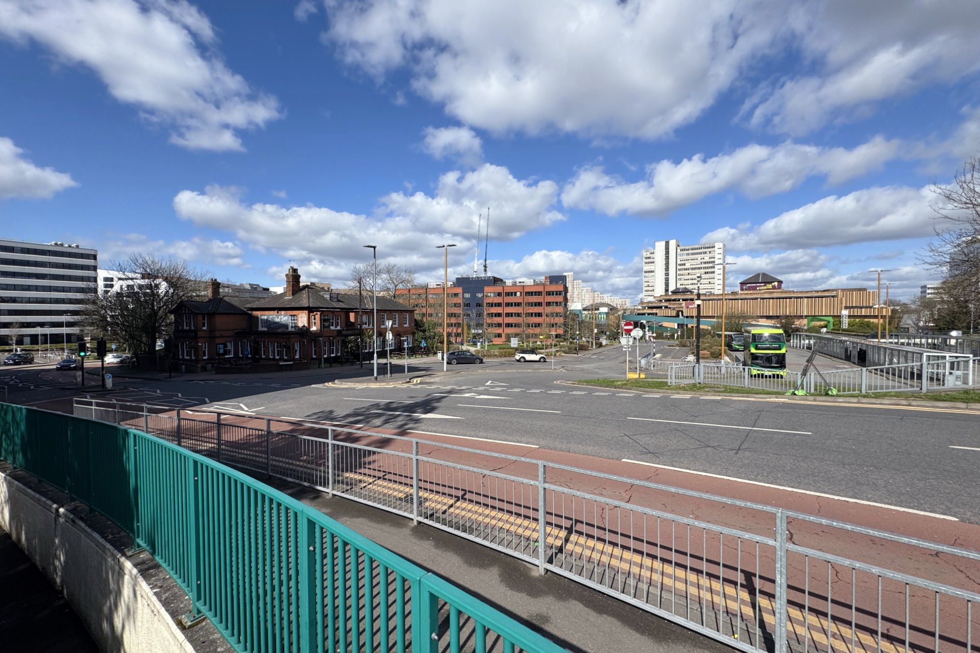 駅の正面にはパブ(Market Inn Bracknell)。その奥にはバスターミナがあり、道路(ザ・リング/The Ring)の向こうにはタウンセンターが見えます。