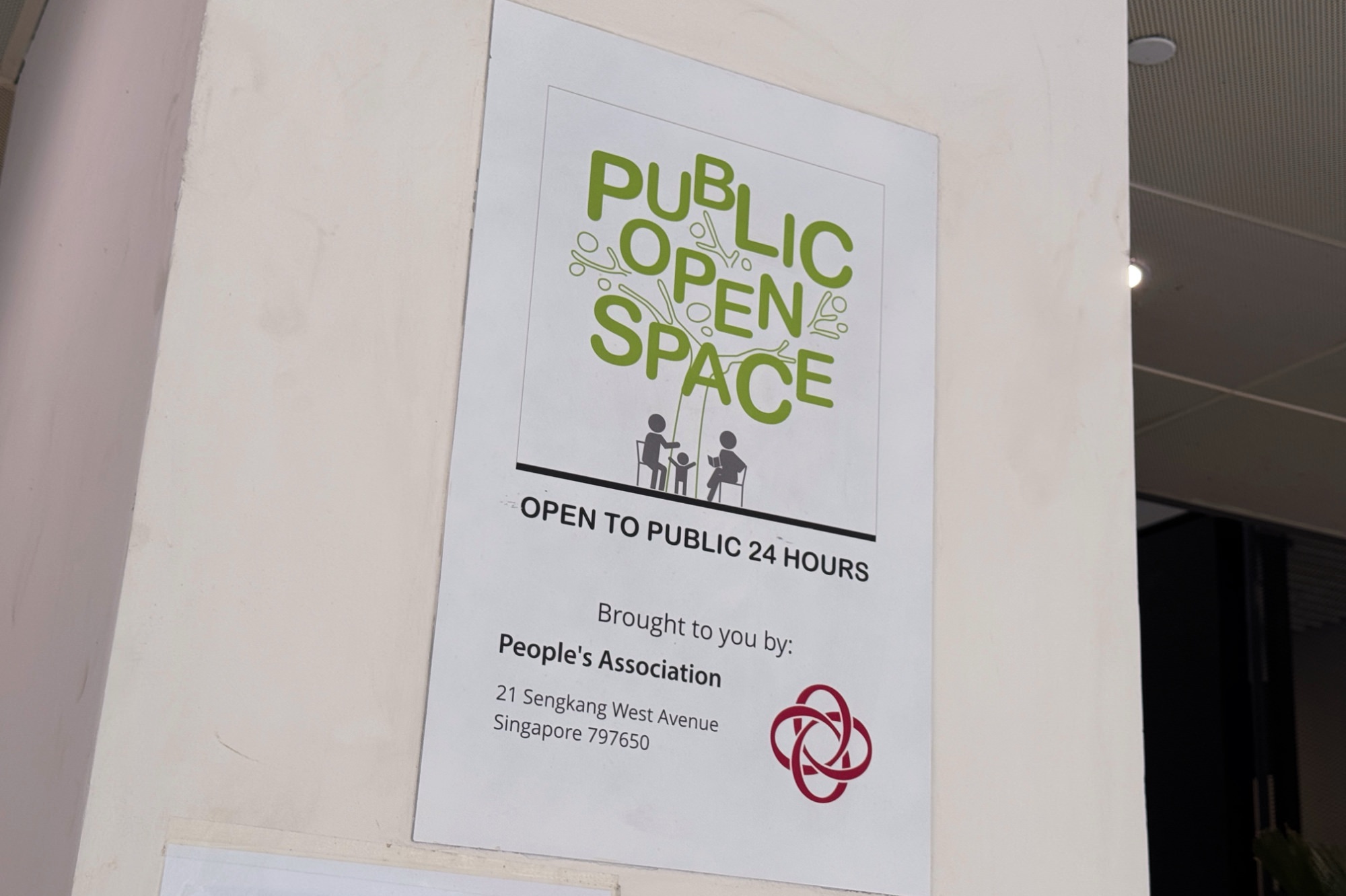 POPOSでは、統一された案内板を掲示することが定められています。案内板に記載されているように、シンガポールのPOPOSは24時間、開放されています。