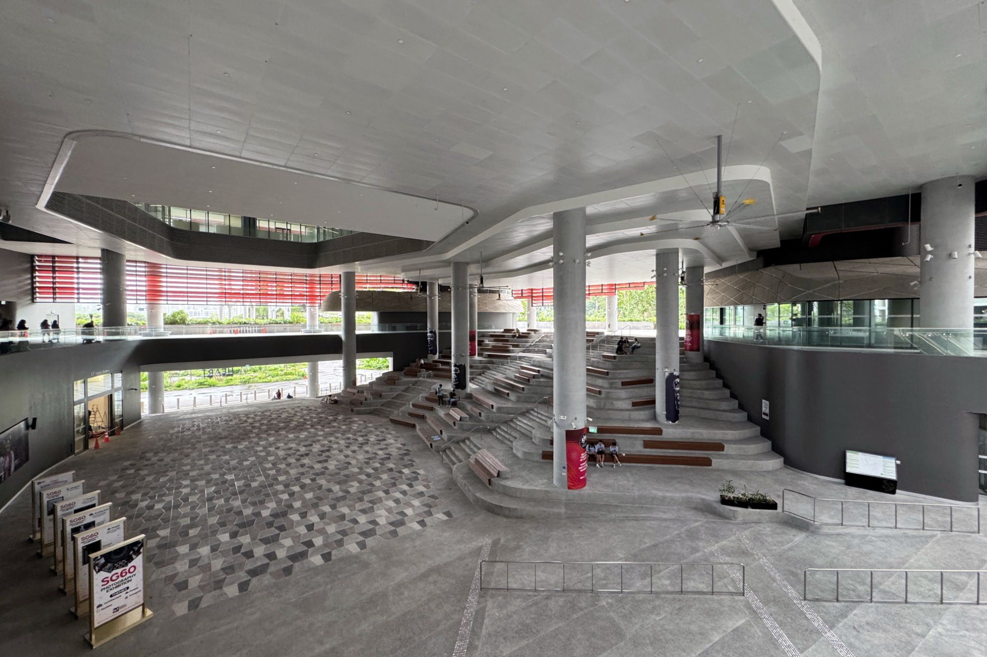 シンガポール工科大学(SIT)のキャンパスは、現在、シンガポール初のスマート地区(smart district)として開発が進められているhttps://newtown-sketch.com/blog/tag/punggol-digital-district(Punggol Digital District)にあります。シンガポール工科大学内のPOPOSは2ヶ所。1ヶ所は、MRT北東線(North-East Line)のプンゴル・コースト駅(Punggol Coast Station)に直結するキャンパス・ハート(Campus Heart)と呼ばれる校舎の足元にもうけられています。POPOSになっている広場は、片方にステージ、もう片方に階段状の座席がもうけられており、ホールのような使い方もできるようです。