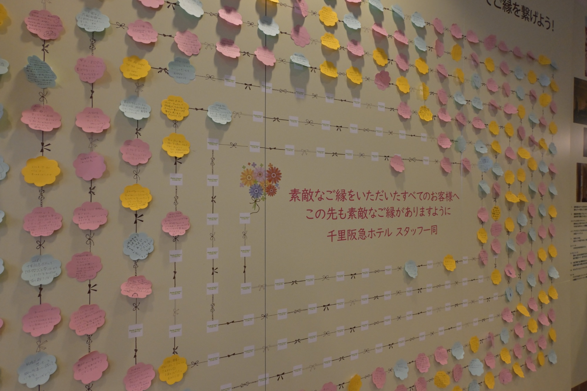 記念撮影したり、建物を撮影したり、メモリアルブースの展示を熱心に眺めたり。結婚式の時に記念撮影したのと同じ階段で、もう一度、記念撮影しようとされている夫婦。夫婦と子ども、祖母の3世代で訪れている方。自分たちはここで結婚式を挙げたと、小学生ぐらいの子どもに話している夫婦。「みんなのメッセージでご縁を繋げよう!」と書かれたパネルは、訪れた人が思い出を書いた付箋でいっぱいになっていました。このような光景を見て、千里阪急ホテルは多くの人々に大切にされていた場所なのだと改めて思わされました。